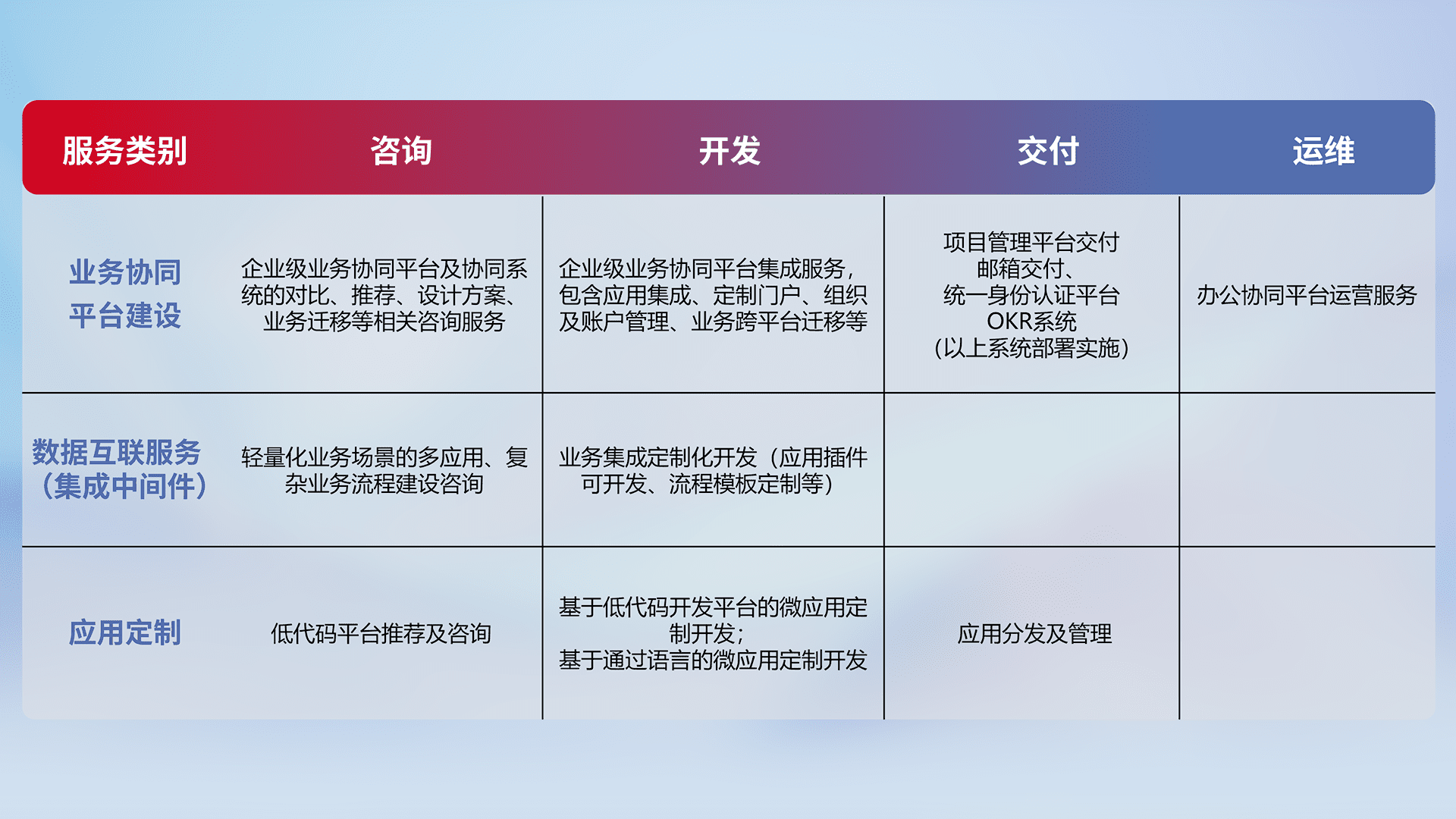 针对钉钉、、、、企微、、、IDaas等平台级产品提供产品的规划、、方案、、交付、、、定制化开发等服务,,,,实现如统一协同办公、、、、智能客户服务、、、、混合会议管理、、、、智能数据查询、、、、等业务场景,,实现数字化转型。。