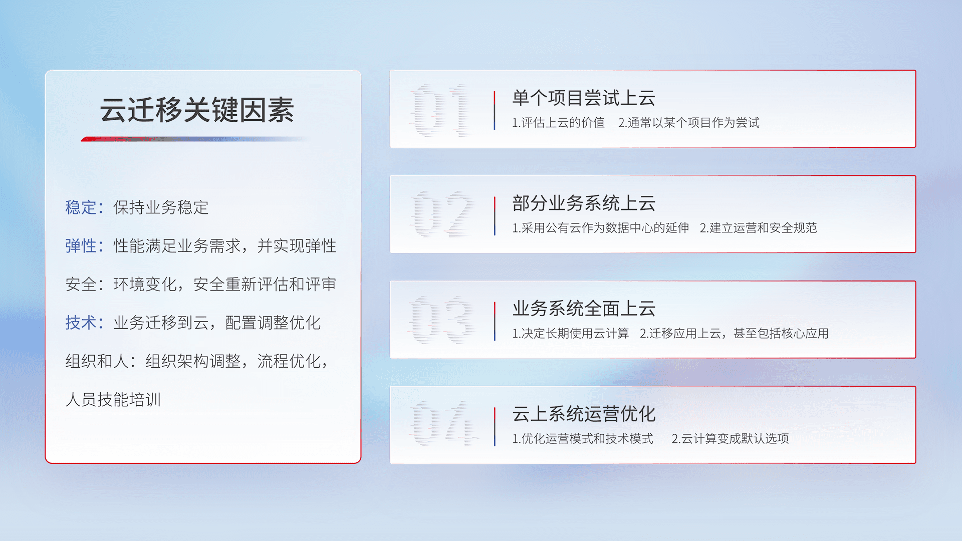 结合实际业务,,,,从规划设计、、、云平台选型、、、、云原生改造、、数据迁移、、集成交付,,,,迁移全过程为客户识别最佳上云路径,,,,做好风险识别管理,,,设计网络架构、、身份权限、、、、安全审计合规、、操作审计、、、日志审计、、、监控告警策略、、、多站点容灾设计等,,对云上基础设施进行整体规划,,,提升IT治理水平,,,,以满足弹性、、高可用、、高性能的需求。。