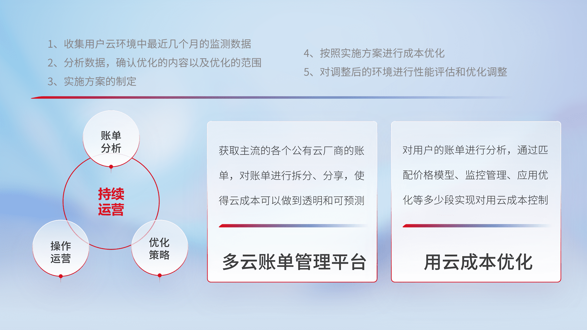 通过多云纳管,,,以统一的资源数据模型把客户的云资源进行抽象和封装,,,,进而实现对多云资源的统一操作,,,保障云资源管理的可靠性、、稳定性与可用性。。量身定制化运维内容,,,,配置、、开发运维、、、、补丁管理、、、、备份、、监控、、认证和访问管理、、、、审计和日常巡检等,,,,保障在用云过程中的可靠度,,稳定度以及高可用率。。。